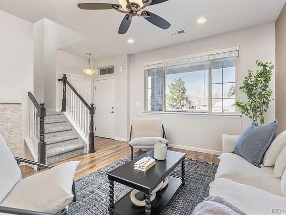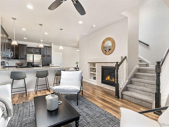 Welcome to your dream home in the vibrant heart of Centennial! This stunning open-concept main floor is designed for effortless living, complete with contemporary finishes, laminate flooring, new carpet and ample storage solutions. The expansive living room, featuring a large front window, built-in shelving, and a cozy gas fireplace, beckons you to relax while enjoying the serene, picturesque views. Transition seamlessly from the dining area to the chic Chef’s kitchen, which boasts an eat-in island perfect for extra seating during gatherings. With tall cabinetry, gorgeous granite countertops, and stainless steel appliances including a gas range, this kitchen is truly a culinary dream come true. The main level is rounded out by a convenient half bath and an oversized two-car attached garage that is well-insulated and equipped with two EV charging capabilities.