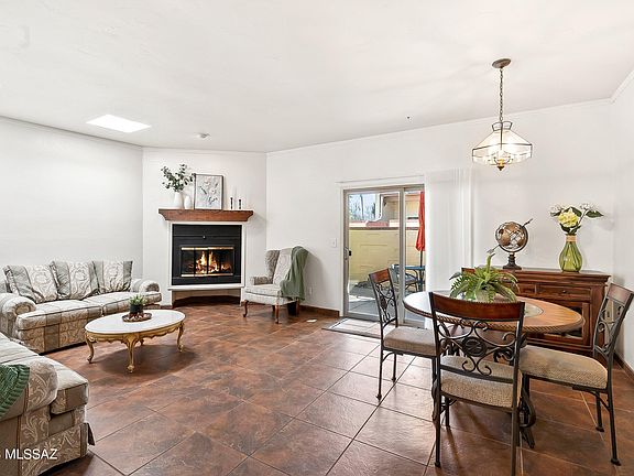 Charming, furnished and move-in ready, corner townhouse in a quiet neighborhood tucked off of the main road and close to shops, restaurants and parks. Bright eat-in kitchen has quartz countertops and fabulous views of the Catalinas. From the kitchen/breakfast nook, the arched doorway leads you into a bright family/dining room with tall ceilings, wood burning fireplace and skylights. Off of the living room is your private patio with mature lemon tree and plenty of room to relax or entertain. Ceramic tile throughout , all appliances stay and so does the furniture! HOA maintains the front yard, streets and exterior of the home. The sparkling oversized pool w/ramada and gas grills are just steps away. This home is turnkey and ready for you to move in!