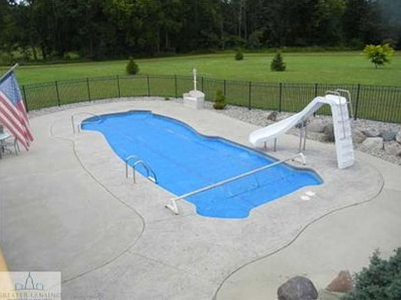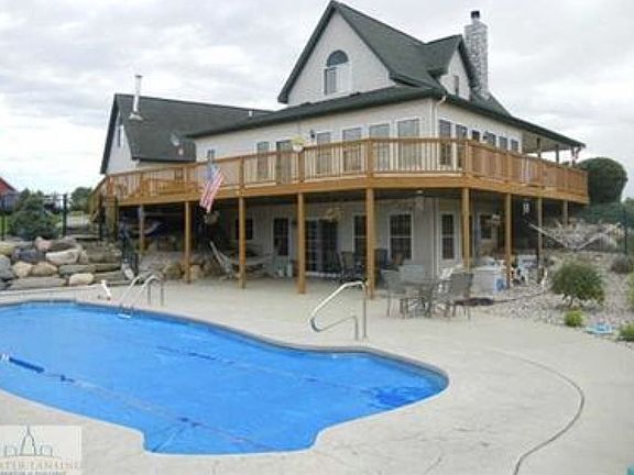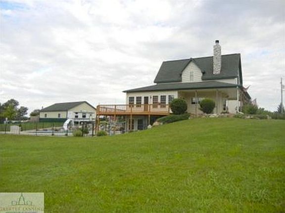 Beautiful country property! Over 6 acres, home sits back off the road and offers 4 bedrooms, 3.5 baths and finished walk-out basement with large family room! Nice finished attached garage with kitchenette, 3/4 bath and finished bonus room above, perfect for home office! Interior extras like hardwood floors, main floor mudroom with laundry, master suite with walk-in closet, large bath and den. High ceilings and lots of windows throughout. Huge wrap-around porch and deck overlooking the heated fiberglass in-ground pool with fiber-optic lighting and more! Nice hardscaping/landscaping. 48x32 pole barn, half finished plus has attic space. Wood boiler system heats house, barn and pool very low utilities! Propane furnace rarely used.
