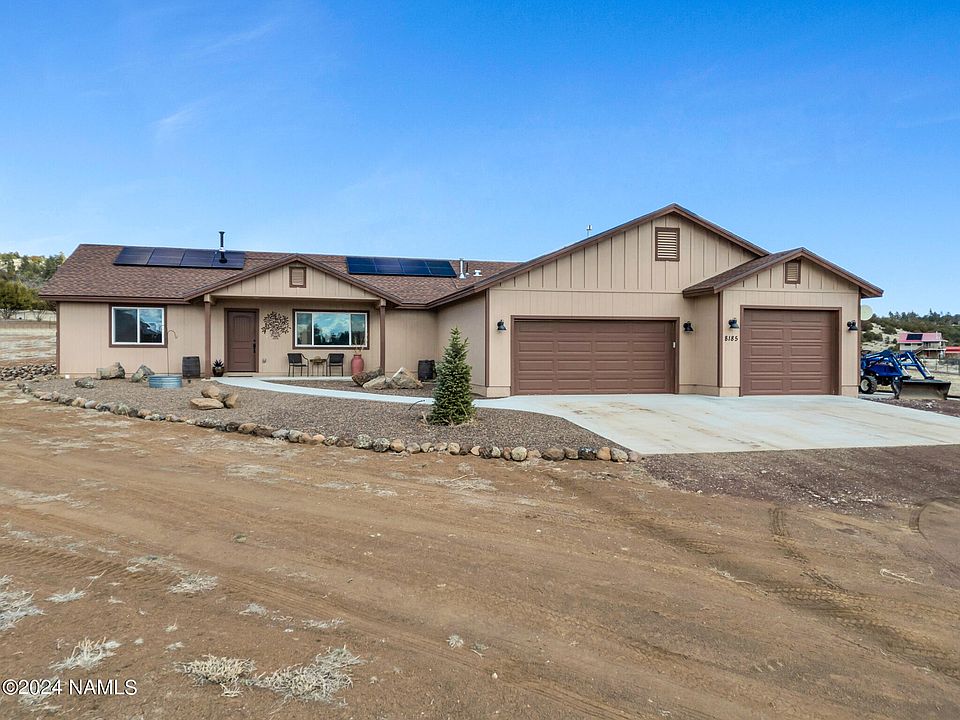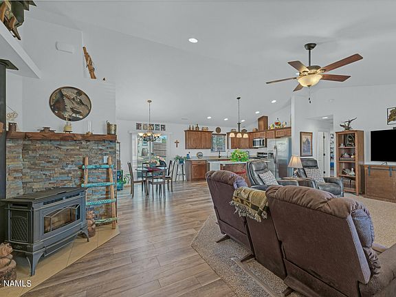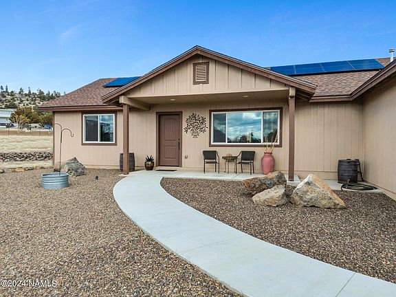 Exquisite SINGLE-LEVEL home nestled on spacious acreage! Situated in serene Doney Park, this recently constructed and impeccably cared for house boasts 3 bedrooms, 2 bathrooms, vaulted ceilings, and modern open-concept split floor plan. The kitchen showcases sleek SS appliances, stunning alder cabinets, and luxurious granite countertops. The primary bathroom features a HUGE tiled shower, dual sinks, and abundance of natural light filling the room. Step into your private backyard oasis with a fenced yard, low maintenance landscaping, and breathtaking panoramic views. Start your day on the covered front porch, basking in the beauty of the morning sunrise and the majestic S.F. Peaks. Utilize the 3-car garage for your vehicles or transform it into a workshop. Downtown is only 20 minutes away!