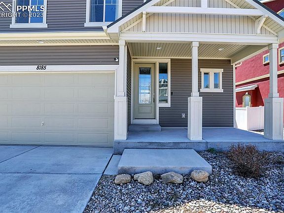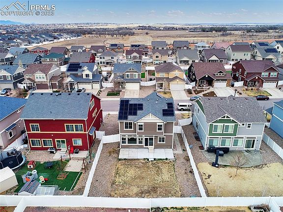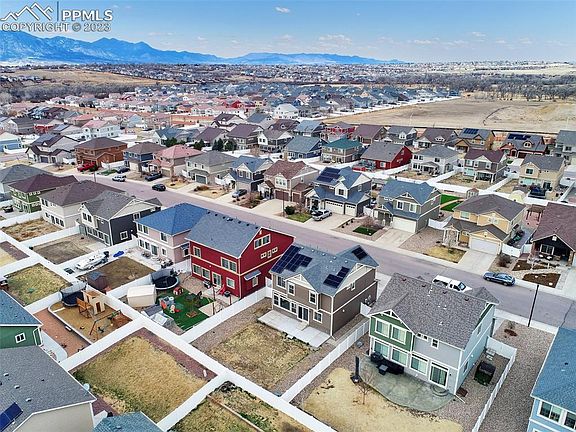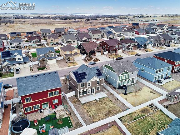 This stunning 3-bedroom, 3-bathroom, 2-car garage home was built in 2016 and has all the features of a brand new home. Enjoy energy savings with recently installed solar panels. The main level boasts an open floor plan, a gas fireplace in the living room, and a beautiful kitchen with white staggered cabinets, granite countertops, and a large island. Upstairs, you'll find a spacious master bedroom with an attached bathroom, two more bedrooms, and a versatile loft/flex room that can be used for multiple purposes. The home is filled with natural light, creating a bright and inviting atmosphere. Located in the desirable community of Cumberland Green, this home has plenty of outdoor space for families to enjoy. The neighborhood features open spaces, playgrounds, and stunning views of the surrounding prairies, where you can spot Pronghorns and Deer in the distance. The home also comes equipped with solar panels, new flooring, new appliances, and a huge extended concrete patio perfect for entertaining. This home is centrally located within a 20-minute drive of Schriever AFB, Peterson SFB, and Fort Carson, making it ideal for military families. Highway access is just 5 miles away, providing easy access to Denver and Pueblo. Shopping and dining options, including popular restaurants like Black Bear Diner, Noodles and Company, and Bird Dog BBQ, are just minutes away. And if you want to explore downtown Colorado Springs, it's just a short 20-minute drive away.