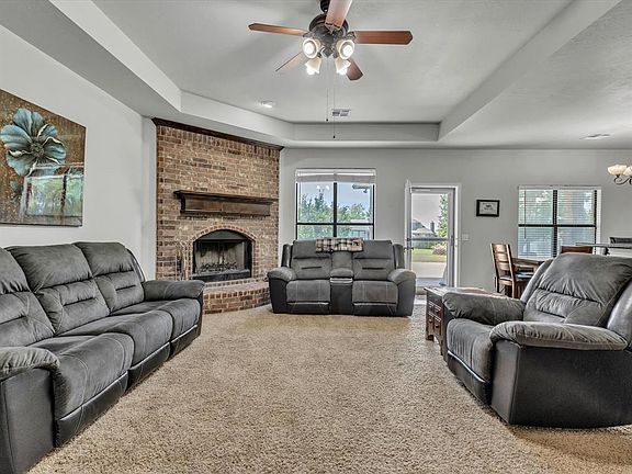 Welcome to the highly sought-after Highland Trails community! This home features 4 bedrooms, 2.5 baths, 3 car garage, half acre lot, and a BRAND NEW ROOF and GUTTERS being installed prior to closing. The living room includes a wood-burning fireplace, built-in shelving, and natural light. The kitchen is open to the dining area and includes granite countertops, stainless steel appliances, and a walk-in pantry. You'll find the master ensuite on one side of the house. The master bedroom showcases a tray ceiling with a ceiling fan. The master bathroom includes double vanities, a whirlpool tub, a walk-in shower with a new shower door, and a walk-in closet. The 3 secondary bedrooms and full-size bathroom are on the other side of the house. There are built-in shelves in the laundry room, half bathroom for guests, water softener, tinted back windows, security system, and newer stove (2023) . Outside you'll find an extended patio with covering, fenced-in yard, fire pit, storage shed, and landscaping. Perfect for entertaining. Highland Trails features a community playset, clubhouse, volleyball courts, basketball courts, walking trails, and pool. Edmond Public Schools. Be sure to check it out.