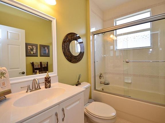 3rd b/r does not have a closet. Brand new Lennox a/c unit 18 seer, installed Jan, 2015. Magnificent Portofino model with all of the upgrades and on water. Neutral porcelain tile throughout set like marble on the diagonal, including bedrooms. Beautiful crown molding plus large accent modeling around all doors in the foyer. Chair molding in the dining room & sconces. Gorgeous wall unit in the office. Like new top of the line s/s Samsung appliances: 3 drawer French refrigerator 28.3'', d/w, & stove. Like new LG microwave. Crown on top of cabinets, upper cabinet lighting, upgraded s/s faucet, full tumble marble back splash with marble accents, granite composite sink, tiled snack bar wall with marble inserts. Unlike most Portofino, the pantry wall has been opened and there's now a server with