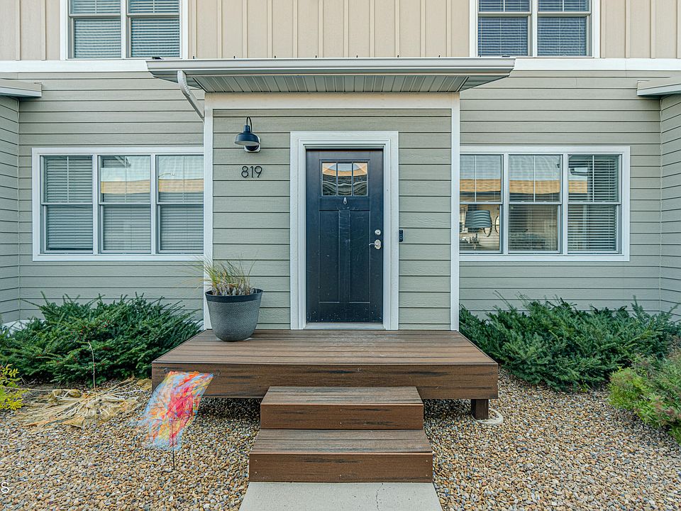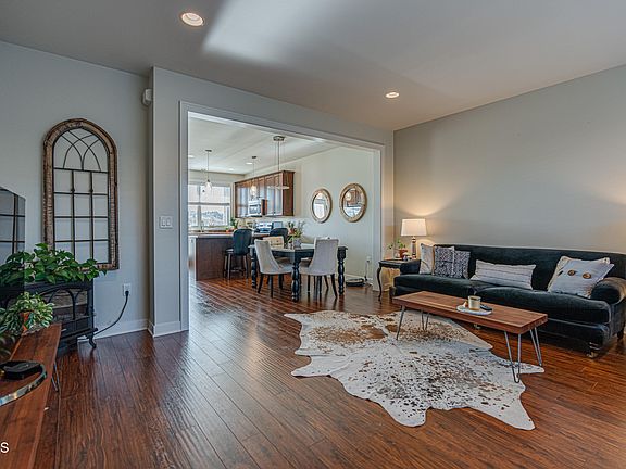 Modern living in this townhouse that blends style & functionality. The exterior is maintenance-free which includes lawn care & snow removal. The main level has laminate hardwood flooring throughout & high ceilings, creating an atmosphere of openness & luxury. The open layout & natural light from the large windows seamlessly connect the kitchen, dining, & living room. The kitchen features include stainless steel appliances, great countertop space, ample cabinet storage with pantry space, undercabinet lighting, counter seating, & a patio door that opens to the cover deck. The spacious dining room can accommodate a large table. The living room is the perfect setting for relaxation & entertainment. It has great lighting from the large windows & recessed ceiling lights. Completing the main level is a dedicated laundry room, 1/2 bathroom, & storage room. The upper-level features two generously sized bedrooms each complete with a private full bathroom. The primary bedroom has a walk-in closet & a private balcony that overlooks the backyard. Additionally, this townhouse has a heated double garage. Great opportunity to own this well cared for home.