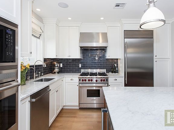 Completely renovated three-story single-family townhome located on one of Hoboken's most sought-after tree-lined streets, located only five minutes from historic Elysian Park and the Hudson River waterfront. Situated on a wide 20.33'x75' lot, the home comes complete with the most coveted Hoboken amenity, parking for three cars, including a private one car garage and a driveway for a second vehicle. This exceptional townhome underwent a complete gut renovation in 2014, including all new plumbing, electrical, framing, windows, mechanicals and insulation. The home offers three bedrooms, two-and-a-half bathrooms and a second living area that can also be used as a guest room, accented by a wet bar with Marvel wine and beverage refrigerators, and leads to a garden patio with 470 square feet of outdoor living complete with a gas line for grilling. An ideal open plan parlor level combines living dining and kitchen with a powder room and a deck off the kitchen/dining area. The stunning chef's kitchen features gorgeous Carrera marble countertops, Waterworks tile backsplash, custom solid painted wood and walnut cabinetry, a Wolf 36' six burner range, Wolf wall oven and microwave, Marvel wine cellar, Bosch dishwasher and an Italian Fhiaba built-in refrigerator with a stainless steel interior. The third floor has three bedrooms including the master bedroom with a vaulted ceiling, a custom walk-in closet and a French balcony. The guest bedroom features a custom built-in desk and murphy bed. The spectacular marble clad bathroom comes complete with a double vanity, powered Robern medicine cabinets, California Faucets, Toto toilet and an enormous steam shower room with four showerheads and a freestanding Victoria & Albert deep soaking tub. The superior level of finish is exemplified by the quarter-sewn solid white oak floors, three zones of high-efficiency hydronic radiant in-floor heat throughout the entire home as well as Marvin windows/doors, LG TrueSteam Washer/Dryer, two zones of high-efficiency air conditioning, EMTEK hardware, Hunter Douglas custom blinds, custom fabric drapes, LED recessed lighting, a whole house water filtration system and an additional kitchen water filter. This home has custom California Closets throughout and includes modern conveniences such as three Nest thermostats, Nest Protect smoke + CO detectors, four LED flat screen TVs, three universal remote controls and integrated speakers with 10 zones of SONOS audio. The home is ideally located around the corner from Washington Street's boutique shopping, restaurants and the NJ Transit bus route with service to Port Authority bus terminal in approximately fifteen minutes.