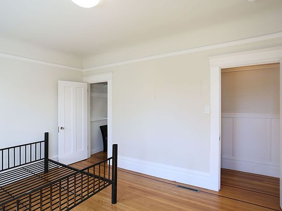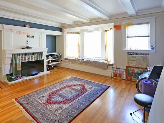 3BR/Split BA, second floor full flat in the Mission. Flat has hardwood floors except in kitchen, laundry room, and baths. Living room has bay windows with a seat and an ornamental fireplace. L-shaped kitchen is open on one side to the living room. It includes gas stove, microwave, has lots of cabinets and counter space. Stacked washer and dryer are in a room just off the kitchen. Two large bedrooms are at the back of the flat, overlooking the yard. Third, smaller bedroom is mid-flat. Bath is near the rear bedrooms. Bath floors are heated. It has shower-over-tub with glass divider and the WC is directly across from it. Linen closet is down a hallway adjacent to the WC.
