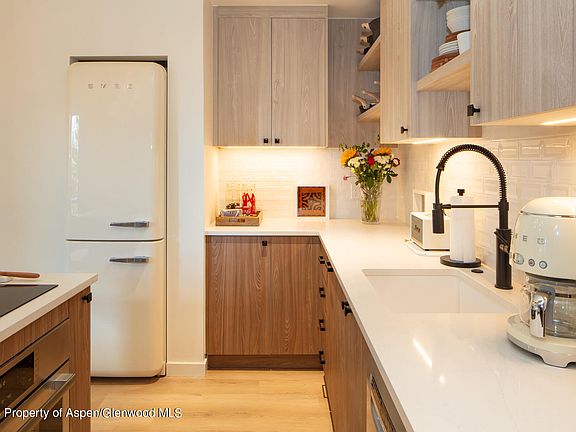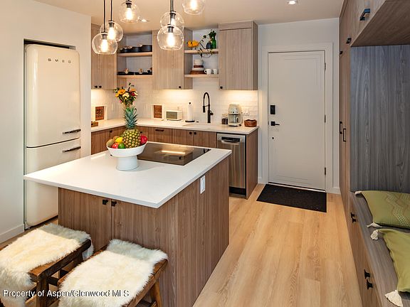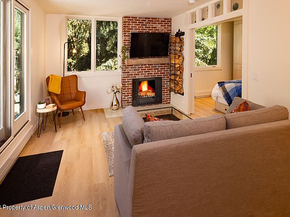 Brand new, turn-key, one bed, one bath in Aspen's central core. This meticulously thought-out, top-floor renovation was taken to the studs and exhibits the work of local artisans. A modern kitchen with vintage flare has plenty of room to cook and host friends. The private patio and big windows fill the living room with light and fresh air. Cozy up by the wood-burning fireplace amongst the pines. Double French doors open to the bedroom with a built-in bed and storage underneath. The spacious bathroom has heated floors, surrounding mirrors and washer dryer. Custom cabinets with accent lights maximize storage throughout. Additional amenities include one assigned parking spot in the front of the building and a large storage closet in the basement. Small complex, great location.