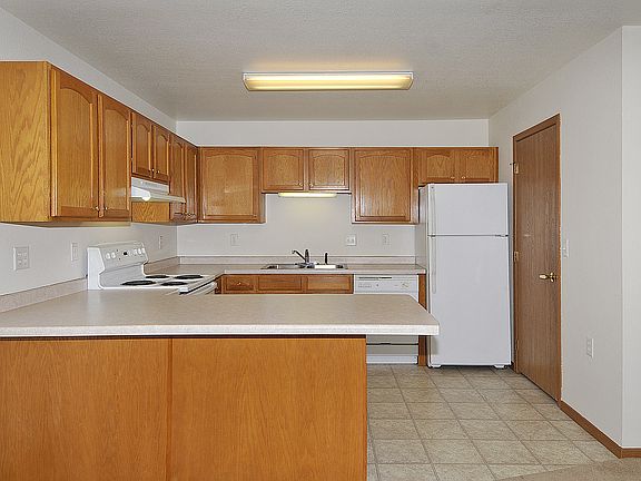 River Trail Apartments offer Deluxe 2-bedroom condo style units with walk out patios or decks on each unit. They also include a garage with remote opener and electricity. Each apartment is 1000 sq ft with an open floor plan featuring large bedroom, a breakfast bar, and a walk-in pantry. Free Heat. Close to parks and schools. Nice neighborhood. We require renters' insurance. Utilities included in rent: Heat/Gas, Water, Garbage, Soft Water and Lawn and Snow Removal. Residents Pay: Electric Rent per Month: $1250.00 Deposit: $ 1250.00 Application fee: $75.00 Per Adult