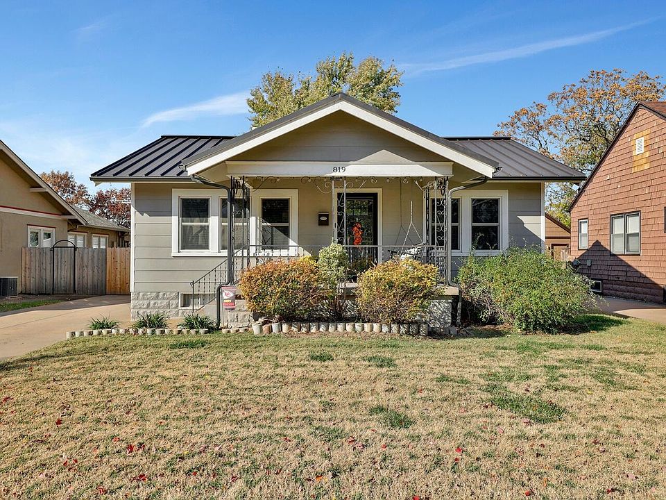 Absolutely stunning bungalow in Riverside. Close to museums, walking and bike paths, golf course, and entertainment. Beautifully landscaped with an impact resistant metal roof, matching roof to be added to the garage in the coming weeks, gives this home a modern look. The spacious living room with beautiful, refinished wood floor and white trim opens up to the dining area for a great entertaining space. Perfect reading nook or office space off the dining area looks out into the back yard. Kitchen is well equipped with gray cabinetry, stainless appliances, and plenty of natural light. Master bedroom is large enough for a king size bed and a seating or makeup area with a jack and jill, 3-piece bathroom. Second bedroom on the main floor has a walk-in closet. Basement is partially finished as a bedroom and office space but would also make a great rec room. Tons of additional storage space in the laundry and utility room. The back yard is fully fenced with a new composite deck that is partially covered for exceptional outdoor entertaining. The two-car garage is oversized with ample room for cars or a workshop. Updated HVAC, water heater, sewer lines, reverse osmosis system, and irrigation system make this home truly move in ready.