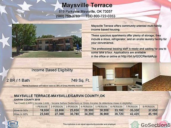 This 749 square foot townhome home has 2 bedrooms and 1.0 bathrooms. This home is located at 819 Parkview Dr, Maysville, OK 73057.