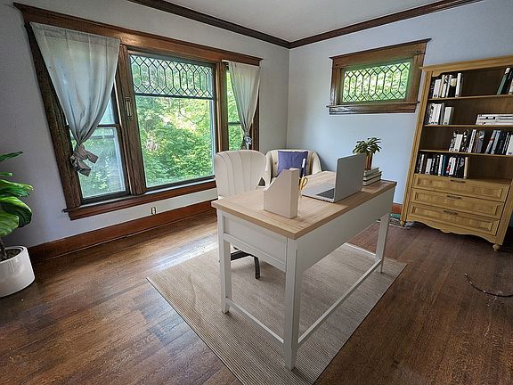 Relax on your front porch and enjoy all the spacious rooms! As you enter the home you'll appreciate all the woodwork and character. Built in bench in the entry, pocket doors and so much more. Front living room, office, formal dining room, updated kitchen and bonus stool on the main floor. Staircase has two ways to take you up to the 4 bedrooms and full bath. Rare finds like brick exterior, laundry chute, built ins and walk up attic. Hi efficient gas forced furnace. New gas water heater. 2 car detached garage.