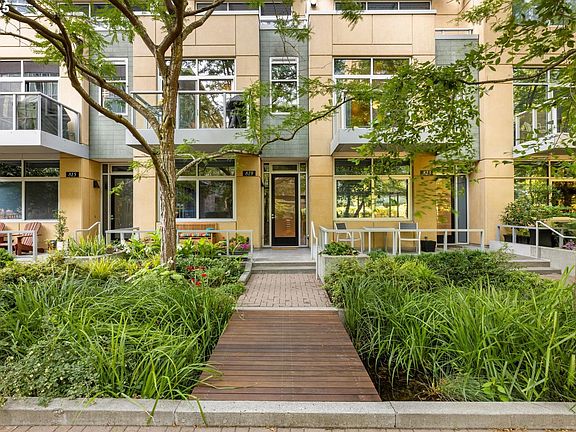 This stylish South Waterfront townhome offers just over 1,800 square feet of light-filled living across three levels - with private street-front entry, flexible layout, and two balconies to enjoy the tree-lined setting. The open main level is ideal for entertaining, with hardwood floors, a spacious kitchen featuring bar seating, pantry, wine fridge, and access to a balcony perfect for morning coffee or evening drinks. Upstairs, the entire top floor is a dedicated primary suite - your own private retreat with a large bedroom, soaking tub, walk-in shower, double vanity, oversized walk-in closet, laundry, and a private balcony. The ground level includes a second bedroom with full bath, great for guests or a home office setup, plus extra storage and direct access to the attached garage. Set in one of Portland’s most walkable neighborhoods, you’re just steps from the riverfront trail, parks, restaurants, OHSU tram, and Streetcar - everything you need for effortless urban living.