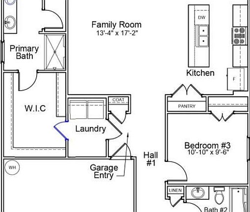 This Lawrence is a three-bedroom, two-bathroom single story home with an open floor plan. The kitchen has generous solid surface countertop and island aside an eat-in area that opens to the great room. The primary bedroom is split from the secondary bedrooms and features a large walk-in closet, dual sinks and linen closet. Both secondary bedrooms also feature double door closets. The laundry room is centrally located and has convenient entry to the primary closet. At the garage entry you will find a coat closet and a linen closet near the secondary bathroom.