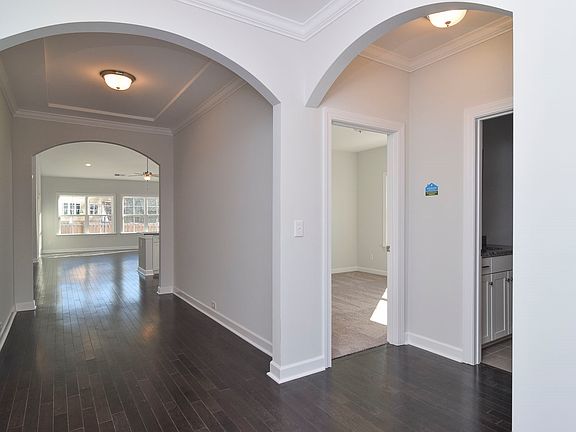 Enjoy one-level living in this Edgewood plan featuring three bedrooms and two baths! Beautiful hardwood floors and arched openings welcome you as you enter and extend throughout the main living areas including the open island kitchen, spacious eat-in area, and family room with fireplace. The kitchen and family room have twelve foot ceilings and the master bedroom has a boxed ceiling. The family room opens to a relaxing private covered porch and the master bath includes a huge five-foot by five-foot tile shower! The kitchen has upgraded cabinets and stainless appliances, including a gas range. All countertops are granite and both bathrooms and the laundry room include ceramic tile flooring.