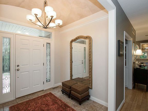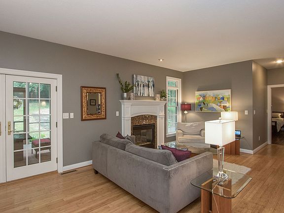 Private, wooded setting featuring a spacious & inviting home. Open concept w/9 ft. ceilings & lots of windows offering light filled interior. Very attractive, high end kit. w/classic white cabinetry, quartz counters '18, SS refrigerator, stove, hood vent, disposal, & dishwasher '18, center island, breakfast bar, crown molding, under/above cab. lighting, striking back splash, pantry cab. w/pull out drawers, & undermount SS sink. Foyer entrance w/unique lighting & crown molding. Cozy gas fireplace w/mantle.