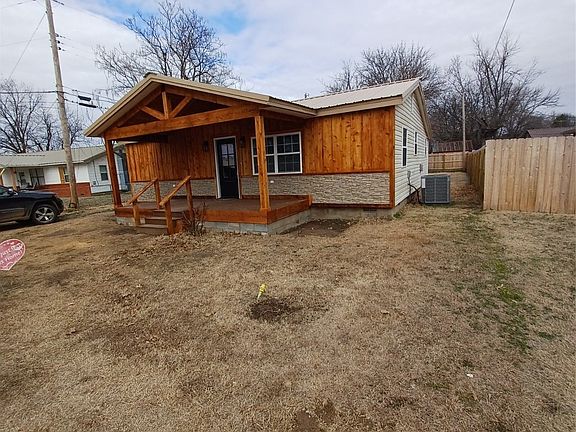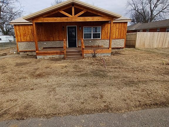 Checotah Home in great location. Home is new remodel and is beautiful. Remodel included removal of all down to studs. New insulation, sheetrock, electrical, plumbing, heat and air, cabinets, metal roof, everything. Open living with a very spacious living room with big windows to allow lots of light. Kitchen has lots of cabinets, granite and a big island with space for seating. New stainless appliances. Two bedrooms and two bathrooms. Master bedroom has private bathroom with walk in shower and a door to a private porch. Wonderful front porch. Big back yard. Close to downtown shopping and restaurants. Call to view this beautiful home today.