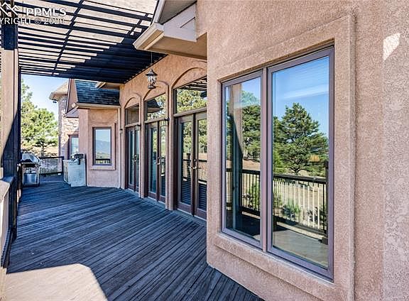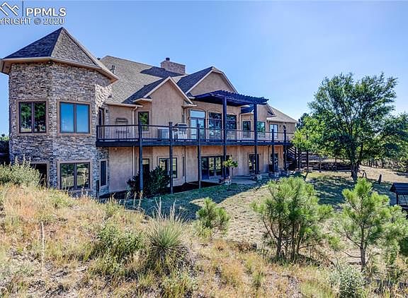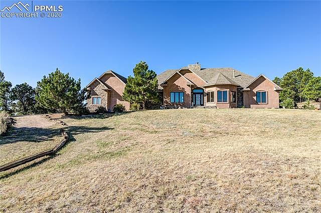 Be prepared to be impressed with this gorgeous stucco/stone 4-5 Bedroom, 5 Bath, ranch style home located on 7.2 acres on the edge of Colo Springs (Black Forest - 6 minutes from Black Forest and Woodmen Roads.) It features unparalleled 360 degree views of the mountain range, Pikes Peak and Black Forest! Located in District 20 schools. Main level entry has floor to ceiling stone see through (to family rm) fireplace. ML family room is adjacent to spacious kitchen. Kitchen has hickory cabinets, pantry, granite counter top, double oven, new gas cook top, microwave and subzero refrigerator. ML office or 5th bedroom has a closet and French doors. ML master bedroom has double doors, gas fireplace, 5 piece bath, double vanity, walk in closet, walkout to 75 x 10 deck and awesome Pikes Peak view. Walkout lower level has two large additional bedrooms, 2 baths, 29 x 20 rec room, 38 x 14 pool/billards Room, and 15 x 14 workshop. There are numerous niches, ledges and alcoves for artistic displays. All 5 bathrooms have granite counter tops and vessel sinks. All bedrooms have walk-in closets. There are multiple sets of French doors that open to ML Deck and Lower level patio. Other features are lighted coffered ceilings, wide curved main staircase, back staircase, 2 furnaces, 2 AC's, 3 hot water heaters, whole-house exhaust fan, 12 ft and 9 ft ceilings, 4 car garage, Newly paved driveway. This home is open and bright and affords terrific views from nearly every room. Zoned for horses (fenced on 3 sides). Close to stores, shopping and restaurants. Welcome to your dream home! Minutes away, worlds apart!