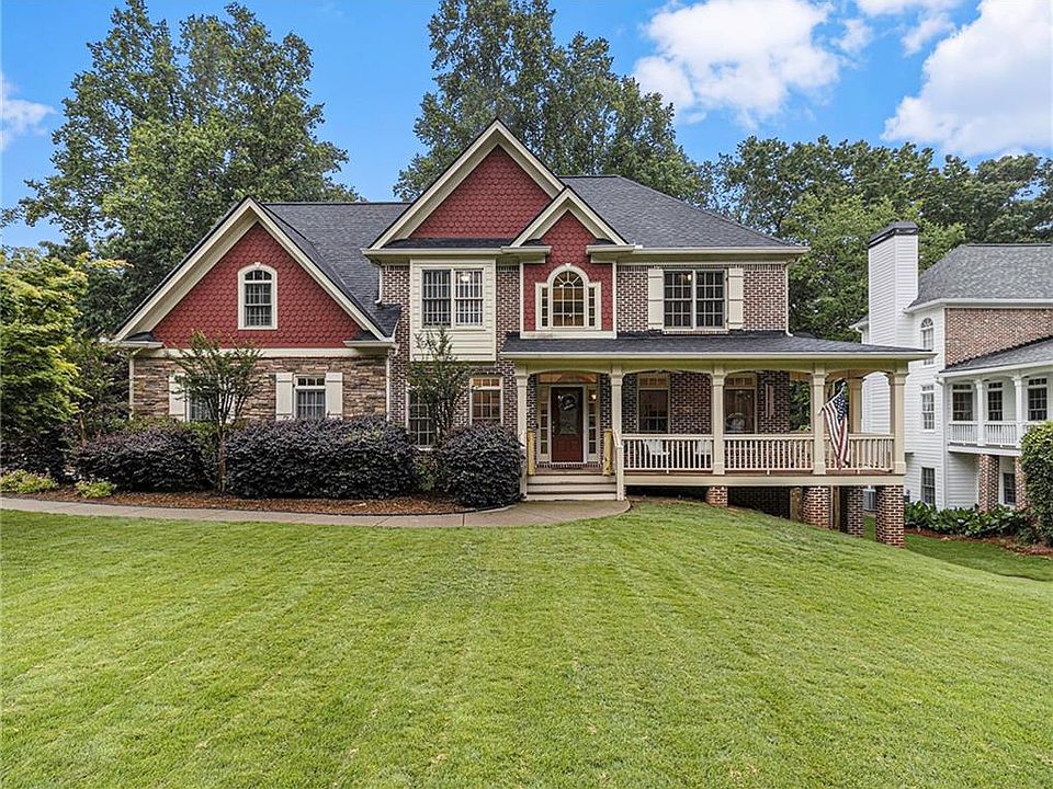 Stunningly updated home close to Lake Lanier, where classic charm meets modern luxury! From the moment you enter, the home welcomes you with a stately façade highlighted by vibrant brick accents and an inviting wrap-around porch. Enjoy the mornings on the charming front porch. Discover a stunning separate dining room with elegant tray ceilings, seamlessly connected to the kitchen from the foyer. Showcasing a beautifully updated chef's kitchen equipped with stainless steel appliances including a high-end Viking range, sleek granite countertops, & a walk-in pantry, this home is designed for those who love to cook and entertain. The eat in kitchen opens to the back deck with views of the private backyard. The two-story family room boasts coffered ceilings and a striking stone fireplace, promising cozy gatherings. As you head upstairs retreat to the expansive primary suite, with a dedicated sitting area and custom-lit vaulted ceilings, enhancing its spacious feel. Relax in the spa-like bathroom with a modern clawfoot tub, seamless glass shower featuring dual vanity, and a large walk-in closet, creating an elegant & functional retreat. The three secondary bedrooms share a large modern bath, and the convenient laundry room tucked away from the main level makes laundry day a breeze. The terrace level offers secondary living with a large flex space, a kitchenette, a full bath, and a private entrance with a screened patio. Practical upgrades include a new roof & HVAC system for peace of mind. Outside, the large, fenced backyard offers privacy, and water features, surrounded by mature landscaping. Located in the Forsyth County School District and convenient shopping & grocery stores.