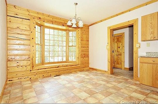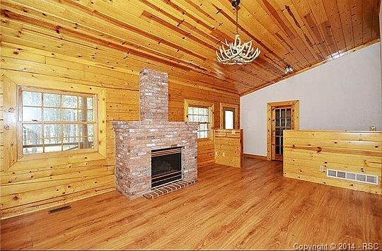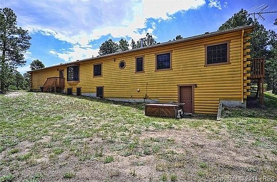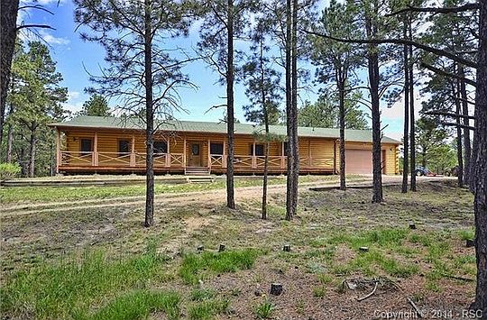 ONE LEVEL LIVING HERE-Fantastic REAL log home situated on 5.5 treed acres in Black Forest on a corner lot. This home greets you with towering pine trees and grassy meadows. Covered front deck runs along the entire front of the home to enjoy the Summer months on. Walk inside and you have a formal living room with fireplace and faux wood on much of the main level. Kitchen has an eat in dining area, new granite counter tops and new stainless appliances. Master bedroom has vaulted ceiling, walk in closet, and 5 pc bathroom.,Main level also features office area and attached oversized garage. Basement is partially finished with 2 more bedrooms and full bath and has walkout to backyard. Detached 1100 sq foot shop will please those needing additional storage room. Its a must see home!