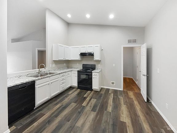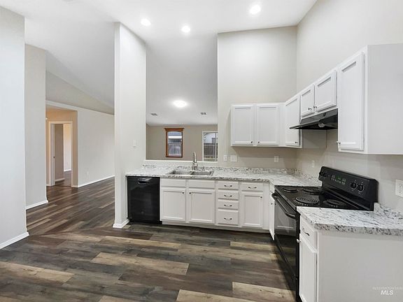 Welcome home! This 3-bedroom, 2-bath Nampa home with a 2 car garage is back on the market after getting updates in December 2022, including freshly-painted kitchen cabinets. The kitchen boasts generous counter space and black appliances. Laminate flooring flows throughout the house, which has plenty of natural light, and a neutral palette. Relax in your primary suite, complete with a walk-in closet, and an en-suite bathroom. Relax with your favorite drink in the fenced-in backyard with a patio and lush grass. Make this your new home today!