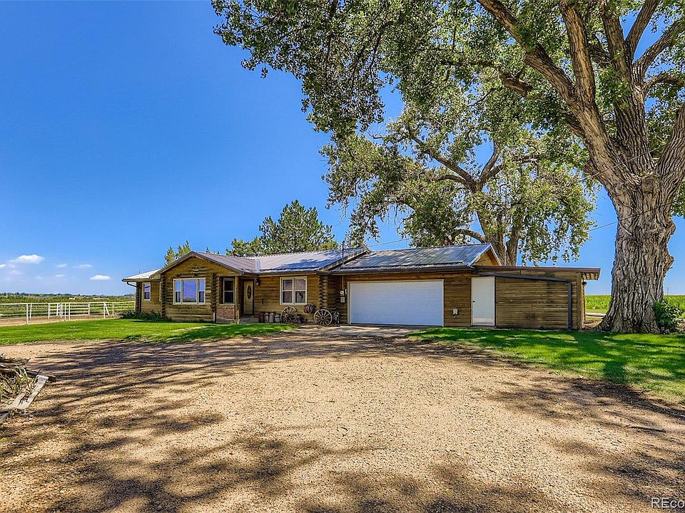 MOTIVATED SELLER! Charm, country living and versatile space all in one package within walking distance of downtown Johnstown yet in unincorporated Weld County. This property highlights Log Cabin siding and a sturdy Metal roof nestled among mature trees. A tranquil setting on 1 acre of private land. This home features 3 bedrooms and 2 bathrooms. There is Cozy gas fireplace in the living room for ambiance and heat. There are beautiful hardwood floors throughout the home. The kitchen features slab granite countertops and pine cabinets. A new furnace and hot water heater were installed in 2021. This home has an attached two-car garage and a separate man cave and storage room. Comes with a horse corral for the equestrian enthusiast. There is a 32x48 foot detached garage/outbuilding with 220V power. No close neighbors. This home is on a septic system and is hooked up to city water. The driveway is on an easement. Plenty of outdoor space for pets, garden, or future projects. Classic country charm combined with practical, functional spaces. This is an ideal property for horse lovers, hobbyists, or anyone seeking a private country retreat with ample storage and stylish finishes. Seller will include the BX1870 Kubota tractor and attachments along with the X390 John Deere lawn mower and attachments. Schedule a tour to see all the rustic charm and potential this home offers. Seller is Motivated.