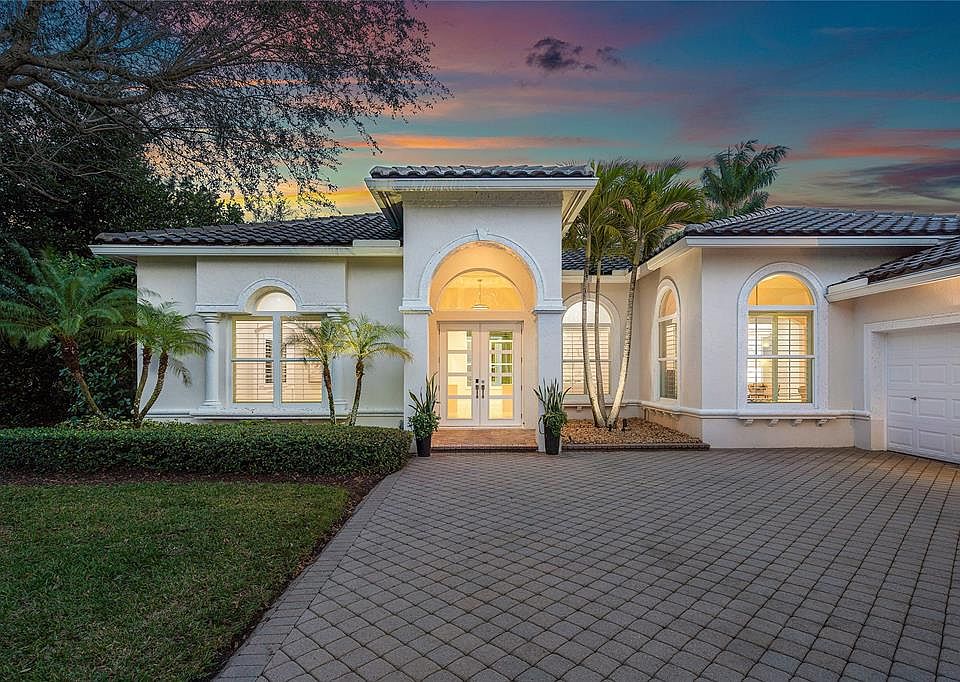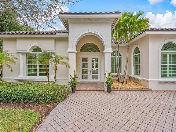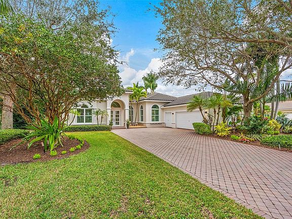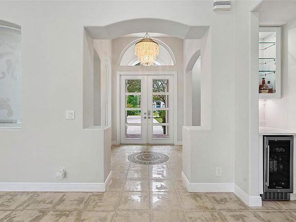 As you enter the home full of natural light, your eyes are drawn to the elegant, state-of-the-art kitchen, outfitted with a top-of-the-line Sub Zero refrigerator, under counter double-drawer beverage cooler with ice maker, double ovens, and an over-sized, waterfall designed island, which caters to culinary enthusiasts. Also, there is a butler’s pantry with a Sub Zero beverage center and a built-in bar with a beverage refrigerator. Double doors lead to your very own private paradise on nearly half an acre with breathtaking views of the golf course and lake. The expansive, fully-fenced backyard is complete with a sparkling, renovated and heated private pool with color-changing LED lights, ample patio space, a lanai with motorized screens, and lush landscaping which offers a perfect private setting for hosting get-togethers or lounging in the Florida sun.