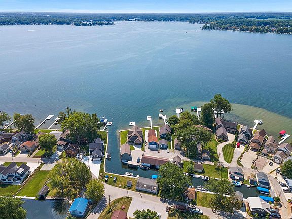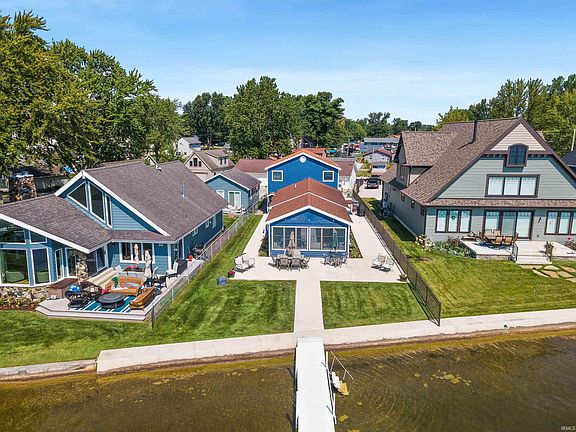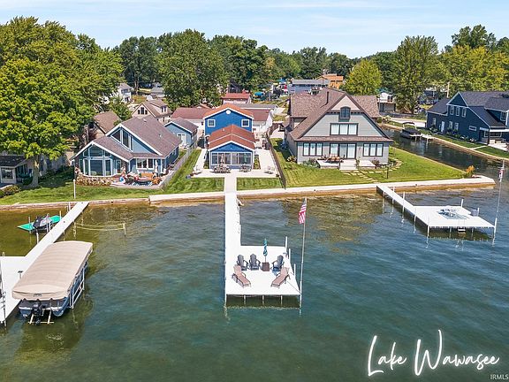 Pier #100 is calling your name! Boasting 50 feet of Lake Wawasee frontage and the sandy bottom that you desire, this striking blue home with contrasting white trim won’t last long. Also included is an additional 45’ of frontage on channel with a workshop, another pier and a boat house! Located at the end of Ogden Point peninsula, there is little traffic. Fresh, poured concrete pad along the side of house connecting to the lakeside patio ensures low maintenance. The yard is flat and has plenty of space to enjoy yard games and drinks on the patio. Inside is plenty of space to entertain and enjoy the stunning view of the lake from the wall of windows in the open living room. With 2,046 square ft, 4 bedrooms and 3 full bathrooms, there is plenty of room for everyone. The ensuite primary bedroom is on the main floor, along with another nice sized bedroom. The two upstairs bedrooms have access to a large bathroom and both feature huge walk in closets. New flooring and paint throughout! Enjoy peace of mind knowing the home is equipped with a whole house generator and tankless on demand water heater. The attached two car garage will provide plenty of parking and storage space. Nice cement seawall and pier with deck for enjoying morning coffee or evening cocktails or just sunning all day long! You will also appreciate having a back lot with a boat house right across the street with a workshop space and a boat well with plenty of room for a large pontoon, plus additional storage. Home has been a successful VRBO. Sea wall, concrete patio, & 4 inch well are all new in 2022. Lake Wawasee is an all sports lake w/ three boat-in/waterfront dining options & tons of year round fun & activities.