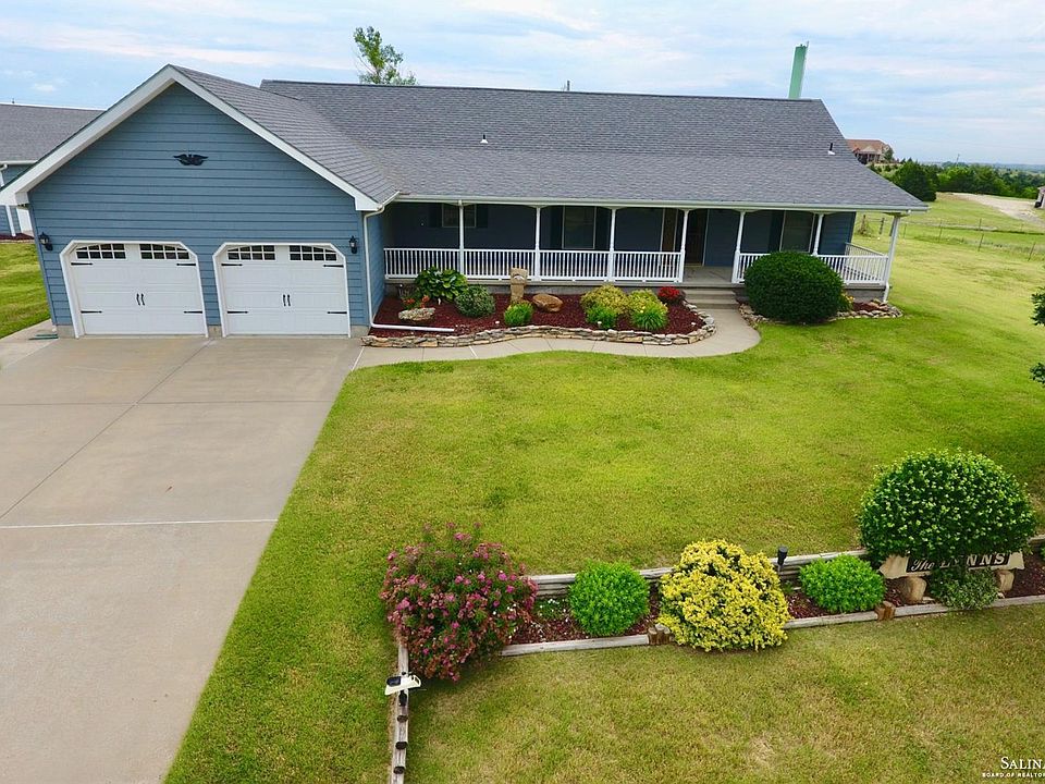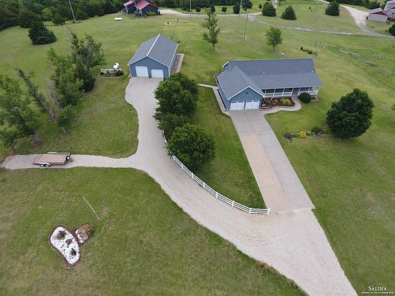 You MUST SEE this picture-perfect ranch style country home. Enjoy the beautiful views from the covered front porch or open back patio. This home features 5 bedrooms, 3 baths, and over 3,000 sqft of living space. Just inside the garage door is a mud room with washer and dryer. Past that is a newly remodeled kitchen with stainless steel appliances and granite countertops. All of this opening up to a huge dining area and living room with a wood burning fireplace that will be sure to keep you warm in the winter and cut down on heating costs. Also upstairs is the master bedroom with a walkout to the back patio. The master bathroom includes his and her sinks, walk in shower, tub with plenty of jets AND a walk-in closet! Downstairs has 2 finished bedrooms with a full bathroom and huge family room for movie nights! Move outside to the 40x30 shed with two overhead doors, and an extra 10' lean-to on the back. The lean-to opens up to Appx 3 acres of fenced pasture. 20 minutes from Salina.