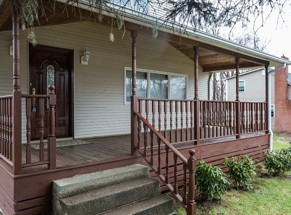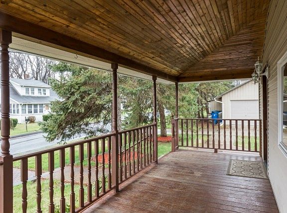 BRIGHT, SPACIOUS Cape with charming COVERED FRONT PORCH opening to LARGE FOYER. KITCHEN is OPEN to DINING ROOM and LIVING ROOM. Kitchen has ample oak cabinets and counter space, island and a picture window and is open to DINING ROOM! SLIDER off kitchen leads to DECK for easy BBQing!! Gleaming WOOD FLOOR!. OVERSIZED GARAGE! CONCRETE DRIVEWAY with plenty of parking. All bedrooms have wood floors. Nice FLAT YARD. MANY UPDATES inc ROOF and BOILER!!