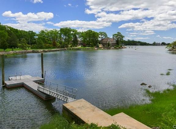 Lovely English style stone home with courtyard complete with fish pond. Located overlooking Scott?s Cove and Darien Land Trust. Dock, extra large swimming pool, expansion possibilities. Architectural features reflect understated elegance and rare attention to period details. Five bedrooms, five and one half baths, four fireplaces. Antique chestnut beams, staircase and fireplace. Cherry paneled English style library. Great room with vaulted ceiling, limestone fireplace, dining room with coffered ceiling. The house is sited for exquisite views of sparkling Scott?s Cove. Separate studio suite with stone fireplace, full bath and private entrance is the 5th bedroom and bath.