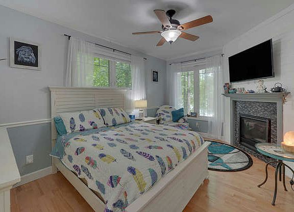 - Exterior: Porch, Wooded Lot, Deck, Fence, Firepit Area, Dock