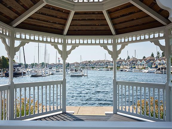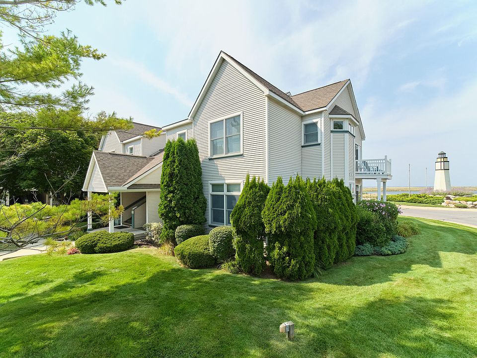 A great price for views of Lake Michigan PLUS very easy access to a sandy Lake Michigan beach! This one story, main floor condominium overlooks a peaceful little inland lake with Lake Michigan beyond. Highly desirable corner location allows extra windows, natural light and only lush landscaping on 3 sides! Immaculate condition, open floor plan, island kitchen, gas fireplace, transom windows, main floor laundry and 2 decks! Master bedroom has walk-in closet and large adjoining bath with double sinks, whirlpool tub and shower. 2nd bedroom plus full hall bath. Large basement for storage or possible game room. Park right outside your door! Amazing indoor lap pool & fitness facility plus outdoor pool, gazebo and walking trails around the Harbor Village marina. Historic beach town of Manistee