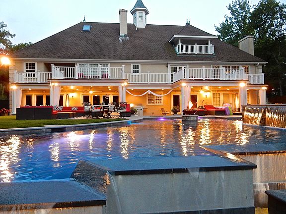 Romantic water views in a flowing light-filled home on two velvety level acres with gated entry and sweeping driveway on a private lane. Marble double height center hall & a large fireside living room w/covered verandah overlooking negative edge pool & scenic pond. Columns, coffered ceiling, wainscot-panel walls are highlighted by an elegant formal dining room, paneled library & family room with great windows & spa-terrace. Chef's kitchen has a French La Cornue stove, center island & breakfast room. Generous bedrooms highlight a huge elegant owner's suite with sitting area, fireplace, his/her baths & walk-in closets. Balconies, water views; wonderful game room, theater and guest suite on third floor. Carriage door garage w/2 lifts, radiant heat, showcase a collector's fleet of cars!!