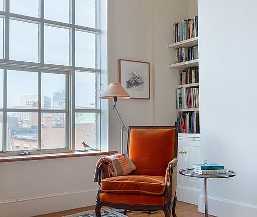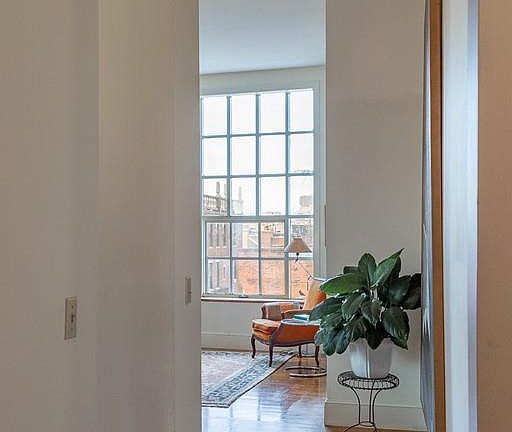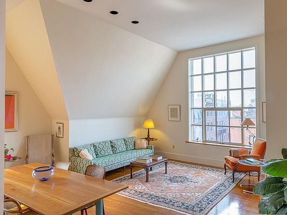 One of a kind top floor two bedroom, two bath condominium unit on the flat of the Hill. Dramatic living room with 11.5 ft. ceiling and towering artist's window offering sunlight and views of Beacon Hill roof tops. Central air conditioning, wood floors, washer/ dryer in unit and an elevator. Older kitchen and baths offer potential to create a breathtaking 1140 square foot residence in one of the most beautiful neighborhoods in the city. There is a common roof deck one flight up. The unit is located in a distinctive stucco and clay tile roofed building at the corner of Chestnut and River Streets comprised of fourteen residential units on levels two through five and five retail condominium units anchoring the street level. Electric HVAC heating and cooling. Hot water included in monthly fee. The condominium association is professionally managed. Pets allowed.