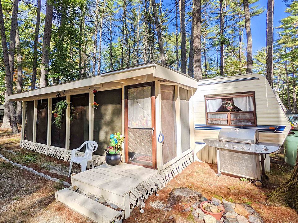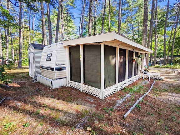 Seasonal offering in Merrymeeting River Community -- cozy camp close to the pool, clubhouse and playground, yet situated in a tranquil location. There's a sense of serenity as you walk into the large screened porch, set up for privacy with bamboo shades and curtains. This camp is turnkey & ready for the summer fun to begin! Cook in the efficient kitchen with the 3 burner gas range or step outside and roast hotdogs over the firepit. This home has 2 bedrooms with the ability to sleep 5-6 people. Bathroom has a new tub and surround; pilot assembly on the furnace was just replaced. This home has forced air heat and central AC! Included in the sale is the furnishings, clothesline, and shed for all of your storage needs! A 5 min walk to the park's private boat launch to go kayaking on Merrymeeting River. Park approval required: credit & background checks, in-person interview. Cash only. No rentals. Strictly seasonal May - Oct. Park Fee $305/mo if paid before the 7th of each month. 1 dog under 35 lbs allowed. The park allows boat parking, & Alton Bay boat launch on Lake Winnipesaukee is only an 6 min drive. Don't miss your opportunity to get to the Lakes Region this summer!
