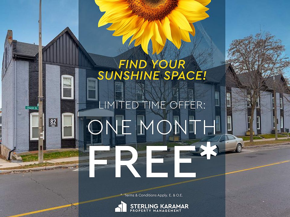 AboutLimited Time Offer | Enjoy 1 Month Free on a 13-Month Lease!*Welcome to 82 Church Street and these amazing St. Catherines apartments. Enjoy Open-concept kitchen featuring modern finishes including chrome accents, hard surface countertops, dark cabinetry as well as stainless steal appliances. Suites also feature upgraded bathroom fixtures and luxury vinyl plank flooring throughout. Live minutes from the heart of the city, and just a short drive away to Niagara Falls.Rental ProcessWe encourage you to schedule a personal showing with our leasing specialist who would be happy to safely tour you through amenities and available suites.Online Payments and CommunicationsProperty Vista resident portal is available to ensure the ease of rental payments, maintenance requests, and communication with property management all accessible online from your personal device.*Pricing, availability, and incentives are subject to change. Conditions apply. Suite features may vary. Images and virtual tours may not reflect actual suite finishes. E. & O.E.** Sterling Karamar Property Management is committed to providing an exceptional leasing experience. We do not request a fee to book a tour or a deposit to reserve a suite. Community Amenities- Convenient online payments & maintenance requests- On-site laundry facility- Pet-friendly- Secure lobby entranceSuite Amenities- Large, brightly lit windows- Hard surface flooring- Bachelor, one and two-bedroom apartments- Renovated kitchen*- Renovated bathroom*- Stone countertops*- Ceramic tile in bathroom*- Stainless steel appliances*Utilities Included- Water