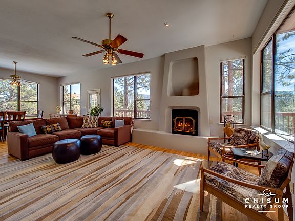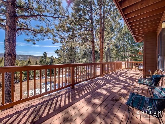 Bright and open and ready for your family gatherings in the mountain, come explore 82 Cimarron Trail. A well maintained home on a gentle sloping lot with mature trees and a nice yard. The level driveway provides easy access and the home is also RV friendly with an RV sized garage, large parking area and a circle drive. The large wrap around deck is amazing in the summer with the trees providing great shade and a tree house feel. Inside you'll find a spacious home with a large great room featuring tall ceilings, a wood burning kiva fireplace and an abundance of windows that flood the home with sunlight. The master bedroom is on the main floor with a private study, walk in closets and an ensuite bath. Upstairs features a large second living space that's perfect for a game room, has additional sleeping space and features another deck with great mountain views. The three additional bedrooms are upstairs with a Jack and Jill bathroom. Additionally, this owner designed home was meticulous built with custom features like a separate work room in the garage with exterior and interior access, a central vacuum system, zoned heating and a large unfinished basement with plumbing that's ready for future bedrooms. This home comes furnished plus it had a new roof added in 2017 with new paint throughout in 2018. It's move in ready and waiting to be enjoyed by a new family.