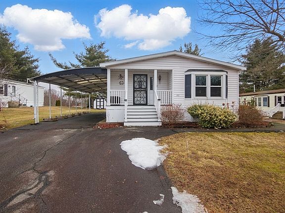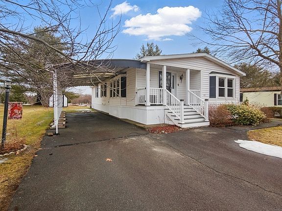 Beautifully updated 2 bedroom, 2 bath home in the wonderful Brush Hill 55+ Mobile Home Community. You'll love this large space with open floor plan and vaulted ceilings. Freshly painted and brand new carpet throughout, new light fixtures, newer siding, windows and deck. The central kitchen has stainless appliances and great cabinet space. The spacious primary bedroom has full en suite bath with double sinks, and there's a good sized 2nd bedroom and another full bath with double sinks. The laundry room has cabinets for extra storage. The large windows let in an abundance of natural light. Enjoy the covered front porch, oversized carport and the relaxing backyard deck. This great home was lovingly cared for and is conveniently located close to amenities and highways.