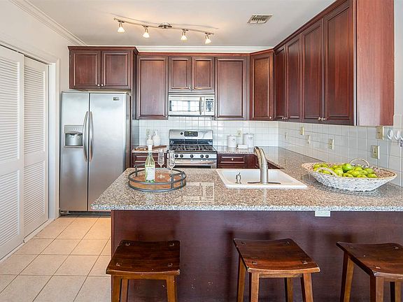 PRIME LOCATION. This remarkable home is located on the top floor of the building and is 5 min from the PATH, Ferry, & NYC Bus. The kitchen boasts matching stainless steel refrigerator, microwave, gas stove & a granite countertop/bfast bar that overlooks the sun-drenched, spacious living room w/ more than enough space for a family to relax. Master suite features giant walk-in closet & en suite bath, while the 2nd bedroom offers ample closets & can easily fit a queen bed. W/D in unit, hardwood floors, recessed LED lighting, & central AC. The building amenities including garage parking, shared storage space, and elevator.