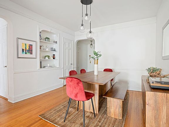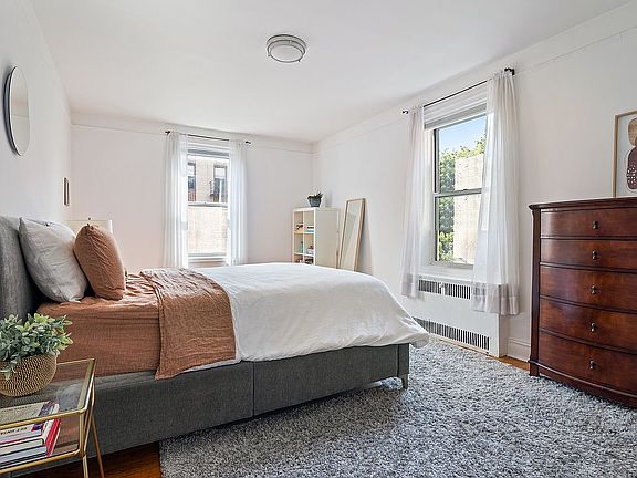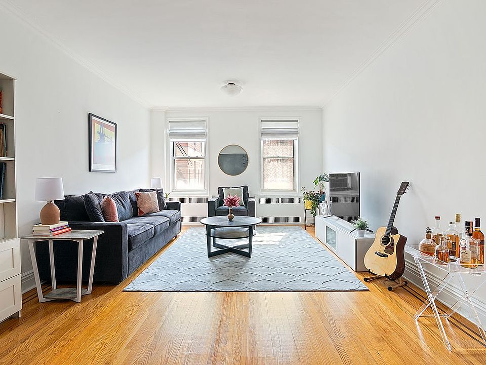 A lovely Windsor Terrace co-op nestled two blocks from Prospect Park, this bright 2-bedroom, 1-bathroom corner home combines an efficient layout with charming original details throughout. Beautiful hardwood floors with border inlays complement arched doorways, built-in wall niches, and plaster moldings. Classic sash windows let in an abundance of southern and eastern light, accentuating high ceilings and spacious rooms. A stacked washer/dryer for an additional $25/month is also included. A welcoming foyer with a deep coat closet ushers residents into an open living room and dining that spans more than 30 ft. Just off the dining room is a windowed galley kitchen adorned with tiled floors, ample cabinet space, a tall pantry, stainless steel appliances, and an eat-in kitchen. The primary bedroom enjoys dual exposure and a large closet, and the second bedroom has southern exposure and its own reach-in closet. All closets throughout the unit have been customized to maximize storage. Both bedrooms have easy access to a windowed full bathroom with a deep tub. 40 Ocean Parkway is a mid-century co-op located in the exclusive Windsor Terrace neighborhood just off the southwest corner of Prospect Park. The building has a live-in super, private storage, a bicycle room, and an elevator. It is close to the Parade Grounds, Prospect Park Lake, Greenwood Playground, and Machate Circle. There are plenty of restaurants, cafes, bars, and shops just moments away, and the F and G subway lines are around the corner. Pets are welcome.