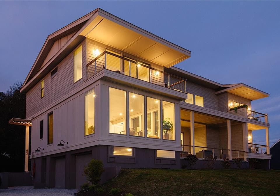 WATERFRONT Completed in 2024. Island Breeze is an exceptional, clean-lined contemporary residence showcasing stunning views over Easton’s Pond, Easton’s Beach, and the Cliff Walk. Thoughtfully designed to maximize its setting, the home features floor-to-ceiling windows along the east and south-facing elevations, flooding both levels with light and views. The open-concept layout flows seamlessly throughout. At the ground level, a welcoming mudroom, two-car garage, large den, water-view office, and elevator access. On the first floor, the heart of the home is the kitchen, with ample counter and cabinet space, a large island, and direct access to a covered water-view porch, off of the living/dining room. Also on this level is a full bath, mudroom/laundry room, and the first of four en-suites—complete with its own balcony overlooking the water. The second level is centered around a den with panoramic views. The southwest wing offers a luxurious primary suite with a private balcony, walk-in closet, kitchenette, and laundry area, plus an additional en-suite—together designed for privacy. The southeast wing includes another spacious en-suite with its own water-view balcony. Outdoor living is equally captivating, with 800 square feet of covered porches and decks, plus a fire pit perfect for sunset gatherings. There is also potential for a pool at the front or rear of the property. Island Breeze combines modern elegance, thoughtful design, and breathtaking waterfront living.
