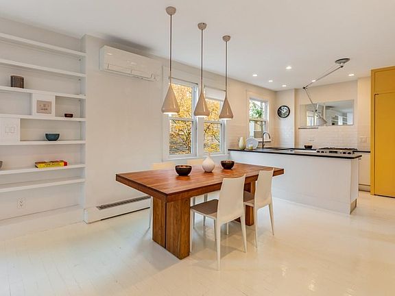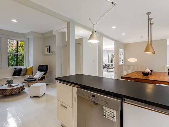What an incredible 4 bed 2 bath two-story penthouse, flooded with natural light, streamlined with sculptural elements of style and echoing modern Nordic interior design. Practical and comfortable with an open plan living concept on the upper level: a big hangout room with a giant overhead skylight, large bays and wood-burning fireplace, a dining area as a central hub with a wall of bookcases, and a streamlined white kitchen with honed granite tops and a playful combination of yellow custom built-in cabinets. Entry level hosts 4 bedrooms with > 8'5" ceilings, tall doors, custom built-in desks or shelves. Master Bed has w-b fireplace and a wall of closet, which artfully connects with a bedroom/nursery or study. The two bathrooms are tailored with glam Porcelanosa tiles and vanities. This is a place of brightness, lightness and happiness on a side street off Mass Ave, a short walk to Harvard & Central squares. Park on street. Walk everywhere. Indulge in this simply extraordinary place