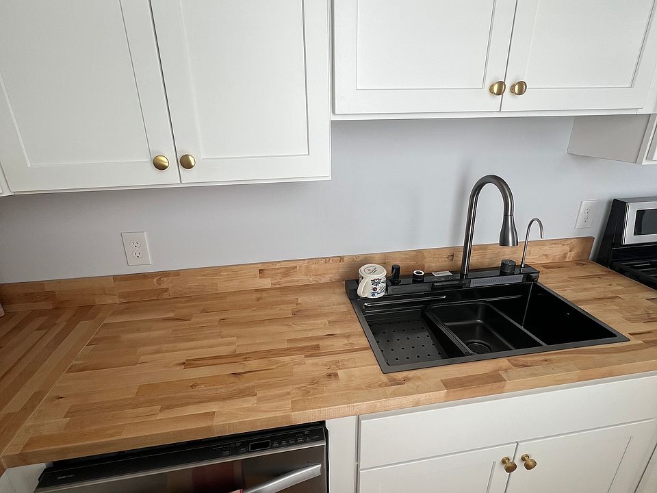 Stylish butcher block countertops and white shaker cabinets with gold hardware