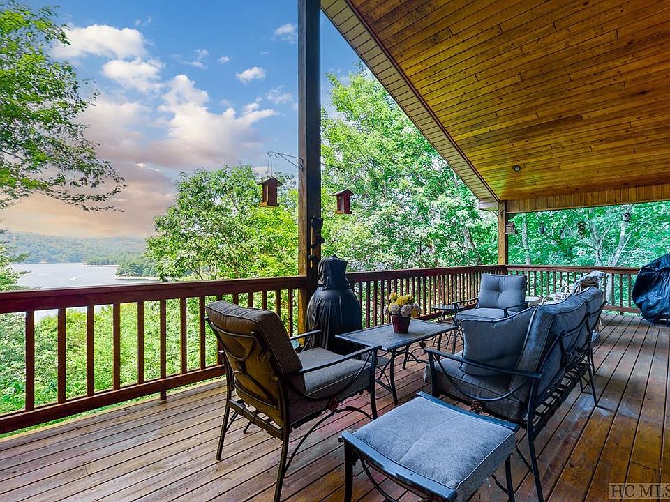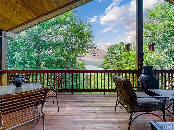 Enjoy year-round lake and mountain views from this well-built home located on the easy-access east side of Lake Glenville. On the main level, you'll love the open floor plan with a huge kitchen, dining, and living room, all opening out to decks, as well as a master bedroom suite and two guest bedrooms that share a bath. The spacious kitchen with breakfast bar adjoins the convenient pantry/laundry room. On the lower level, a studio apartment includes a full kitchen, fireplace, living, dining, and sleeping area, along with a separate entrance and a private deck. Both rear decks are huge and overlook the main channel of Lake Glenville. The view could be improved with trimming. The home has deeded lake access and was built with quality features such as beautiful cypress vaulted ceilings and walls and boasts three fireplaces. It has been lovingly maintained throughout the years. Tucked away in Tater Knob Estates, a private community off Hwy 107, the property is less than six miles/15 minutes to the Cashiers Crossroads for all your shopping and dining desires. Furnishings are included. Two-car attached garage and great parking with circular driveway. Lake Glenville has 1,450 acres of water and is the highest elevation lake east of the Mississippi River. The community has a dock with a waiting list for a slip. This would make a great investment property or year-round home.