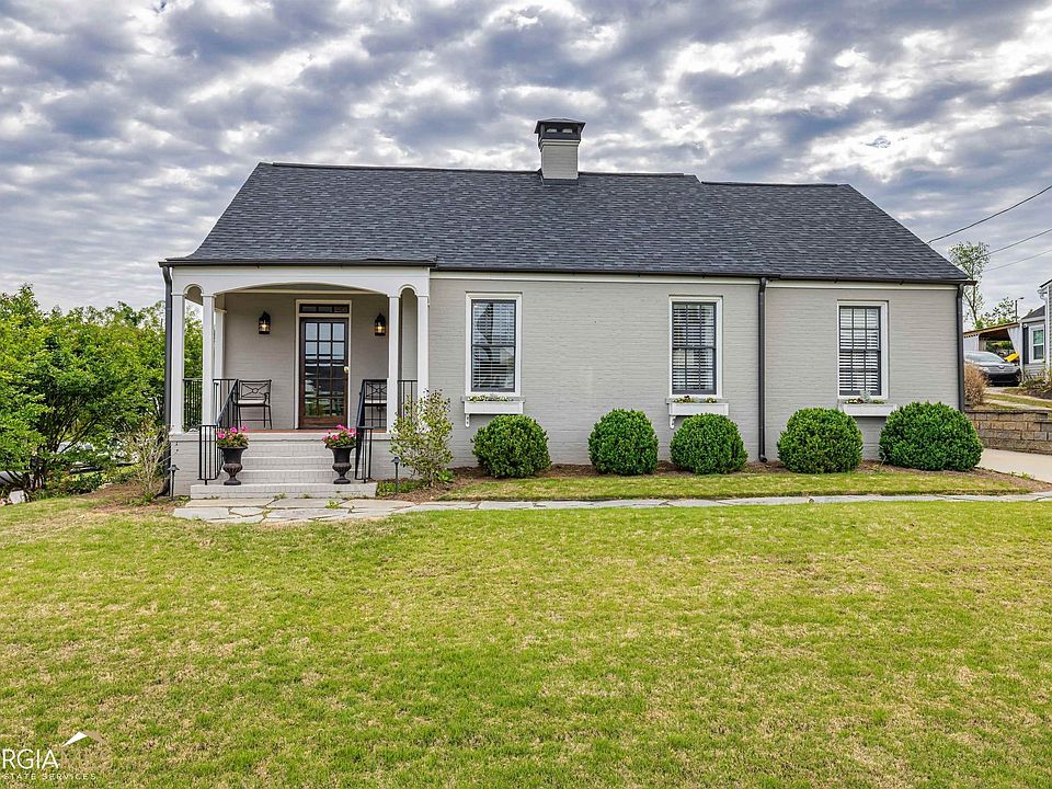 Experience downtown living at its finest in the heart of the Greenville-LaGrange historic district with this 1940s baronial brick bungalow where style and function are not mutually exclusive! This four-bedroom home with three full bathrooms features modern updates such as a new primary suite secluded in the back of the home that includes an oversized bathroom with stepless shower, freestanding bathtub, dual vanity, true walk-in closet with copious storage space and custom-built laundry storage cabinet in mudroom. The updated kitchen washed in natural light makes cooking a breeze with wraparound weathered granite countertops, stainless steel appliances, tile backsplash and floating hood vent. The main floor includes a formal foyer, large living room, two additional bedrooms and an inset reading room where double doors lead to an exterior veranda/lifestyle space great for outdoor entertaining and two car drive under parking pavilion. The backyard is fully fenced. Upstairs has been turned into a dual bedroom and play area with its own full bathroom and extra storage space. New roofing, gutters, and exterior paint have all been completed since 2017.