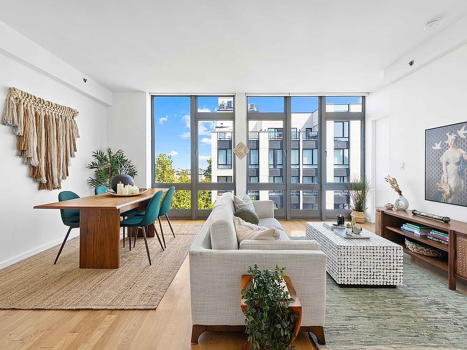 Through the front door, a sun-drenched one bedroom greets you with open concept living, high ceilings, recessed lighting, central air and heat, dining area and stunning floor to ceiling windows with open views of Brooklyn’s sky and neighboring buildings.