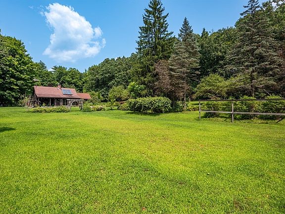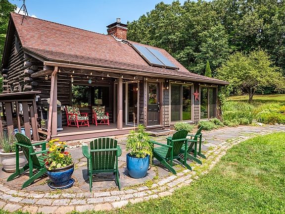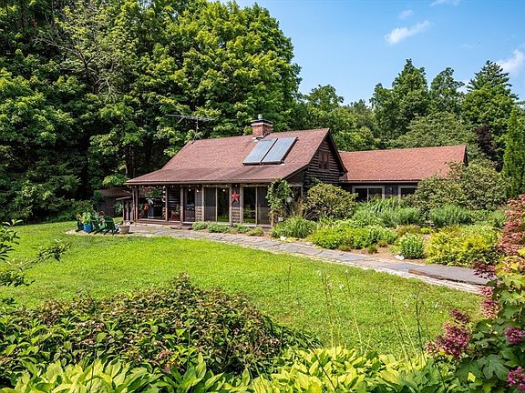 One of a kind beautiful log home on 8 acres in Leverett, short drive to Amherst, hiking, swimming, UMass, and area amenities. Peaceful, picturesque setting with fruit trees, gardens, sprawling front lawn, goshen stone, stream, shed, patio, covered front porch, deck with outdoor shower, backyard solar panels to offset electricity costs. Inside you will find a sunlit dining room, fully renovated kitchen with stone counters, island, wood stove, and custom cabinets. stunning living room with cathedral ceiling, large primary bedroom with access to the deck, two additional bedrooms, and a full bath. Upstairs there is a fourth bedroom, office, full bath, and family room. The basement is finished with a workspace, storage, laundry, connected to utility space and garage. This property has been loved and cherished. Make this your own private sanctuary surrounded by nature. A gem! Come see it today!