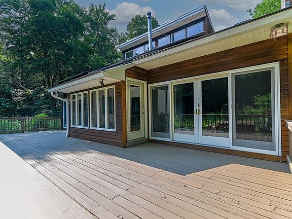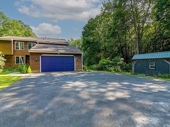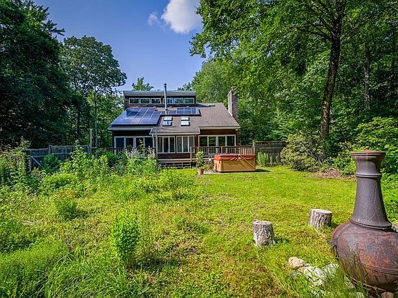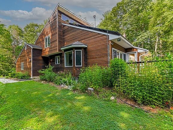 Nature lover's paradise! Beautifully maintained 4-BR/2.5 BA contemporary with 9.27 wooded acre sanctuary. Enjoy mature perennials with continuous blooms throughout the growing season, fruit trees, & lilac bushes. Serene and picturesque Lyman Brook runs through most of property. The home features a lofted open floor plan, wooden cathedral ceilings, 4 season sunroom, heated 2-car garage, masonry stove with pizza oven, stone fireplace, glass sliding doors, and a deck that spans the width of the house. Upstairs: MBR and bath suite with walk-in closet, 2 other BRs, and hall bath. Other highlights: 1st floor BR, and laundry RM, Anderson windows, cedar siding, central air, and a whole house generator, OWNED PV array, woodshed, & outdoor hot tub! Enjoy energy resiliency with 4 ways to heat: Buderus furnace for oil radiant floors & baseboard, propane forced air, wood for masonry stove, and pellets for fireplace. Newly painted inside, stained exterior, and new luxury vinyl tile throughout.