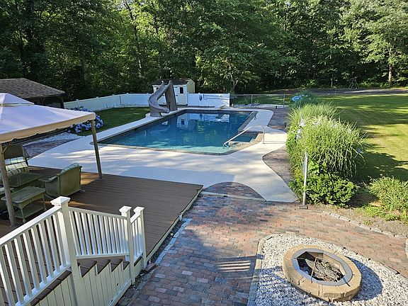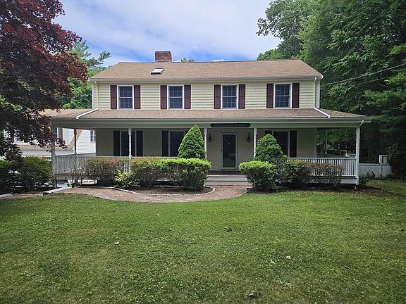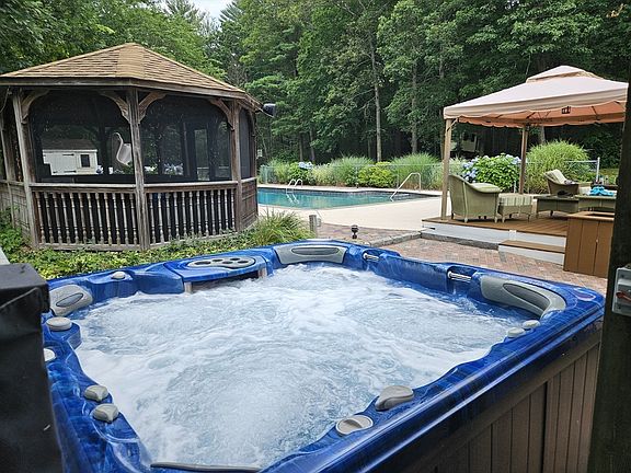 A must see! Sparkling Gunite heated pool, hot tub, spacious decks, gazebo, and pool house. Huge private backyard w/full basketball court. Walk to Norwell's Carlton hiking trails from your backyard. Open great room with skylights, 2 gas fireplaces, den or dining room, large bedrooms, and 3.5 modern baths. Master suite, features over sized spa tub and beautiful tile and fixtures, and ample his and hers walk in closet. Two zone central A/C. Full interior and deck freshly painted. Eat-in kitchen: granite and stainless, double wall oven, gas range, over sized fridge, overlooking private beautiful back yard and connected woods. Four season porch off kitchen on the way to outside decks. Full finished 3 room basement, including full bath. Game room with bar and pool table over large detached 2 car garage, plenty of room for storage and cars. Centrally located.