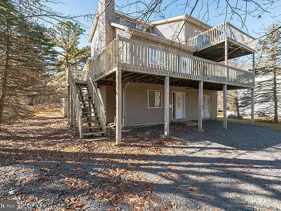 Spacious three story home in popular Pocono community. This home features three stories of living space with at least one bedroom and one full bath on each level. The first level offers a large bedroom with separate entrance and a large game room with full bath and sliders out to a lower level deck with hot tub. The second floor is the main living area and features an open kitchen with dining area, living room with vaulted ceilings and gas fireplace as well as the master bedroom suite with its own bathroom and jacuzzi tub. There is also a second level deck across the entire front of the home as well as sliders to a rear screened porch that opens to the rear deck overlooking peaceful back yard that enjoys bright sunshine all afternoon. The third level offers two additional bedrooms, one with vaulted ceiling and third level deck, the third full bathroom and an open loft area that offers many possibilities. The home is currently used as a short term rental but would make a great primary residence or second home getaway. Schedule your tour to see it today! Owner is a licensed Realtor.
